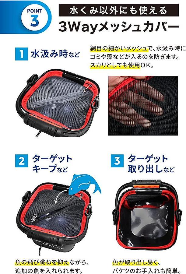 ダブルファスナー式のメッシュカバーが付いており、水くみ時にゴミの混入を防いだり、釣った魚をカバーの窓から入れたりすることができます。