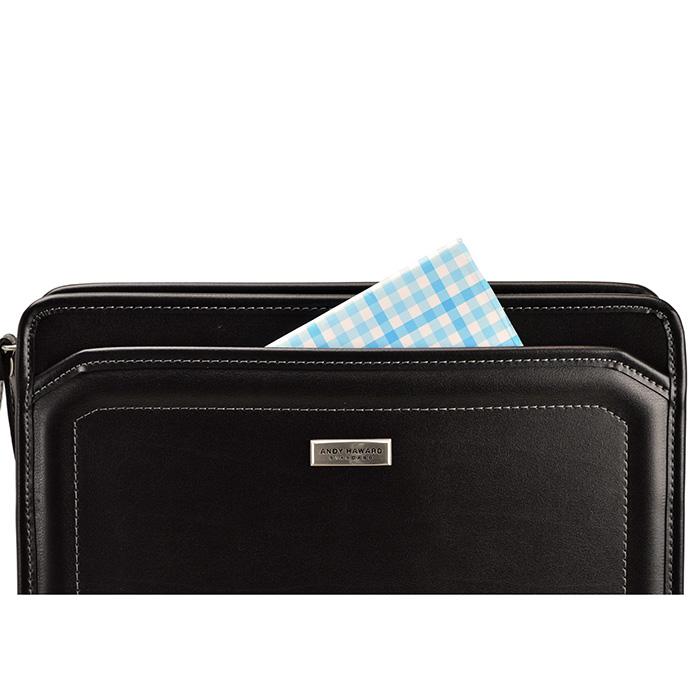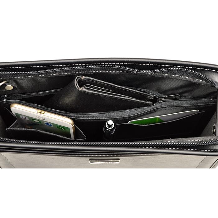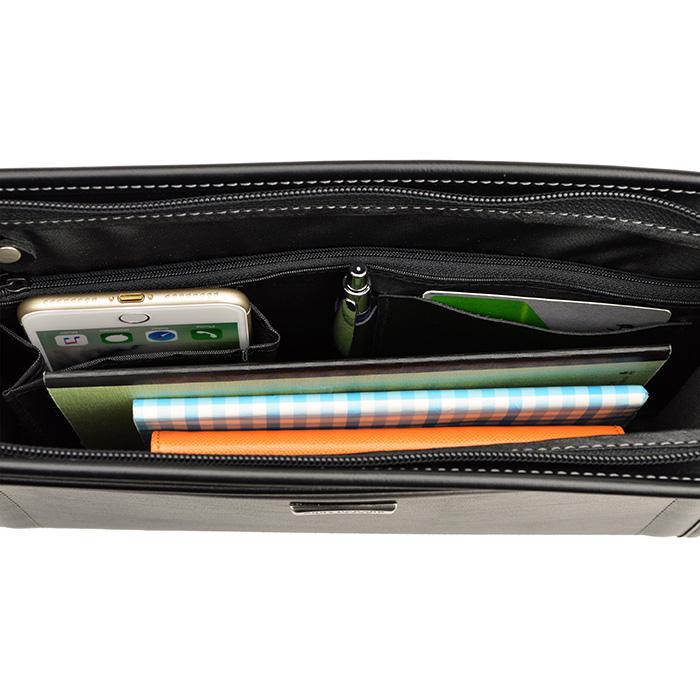 バッグインフォメーションバッグインフォメーション ●サイズ:横幅29×高さ21×厚み6(cm) ●素 材:湿式合皮(軽量タイプ) ●カラー:(01)クロ ●ポケット仕様 ●本体内部:ファスナーポケット、ぺん指し、 カードポケット、マチ付きオープンポケット。 ●重 量:約380g ●生産国:日本(兵庫県豊岡市)
