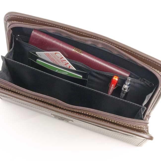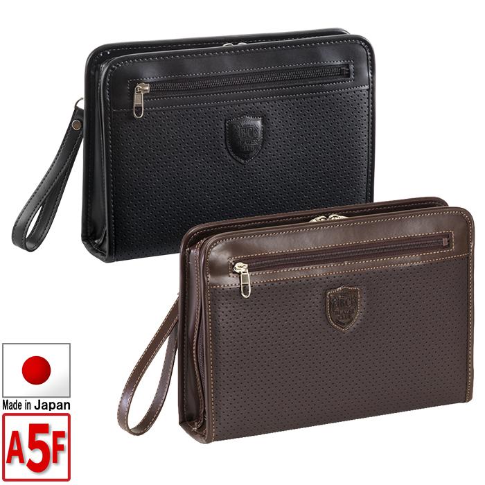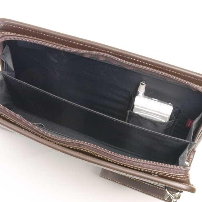 INFORMATION◆サイズ : 横幅29×高さ20×厚み7センチ◆素 材 : 合皮◆カラー : (01)クロ・(04)チョコ◆本体正面 : ファスナーポケット◆本体内部 : 中央仕切り、ファスナーポケット、携帯ポケット、ペン差し、カード入れ◆重 量 : 約420g◆生産国 : 日本