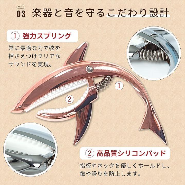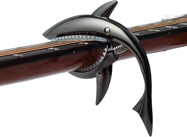 サメ型デザインが特徴的なカポタストは、ユニークでかわいい外観がおしゃれなアクセントとなり、練習や演奏の時間をより楽しく彩ります。
