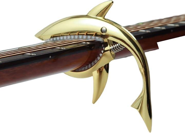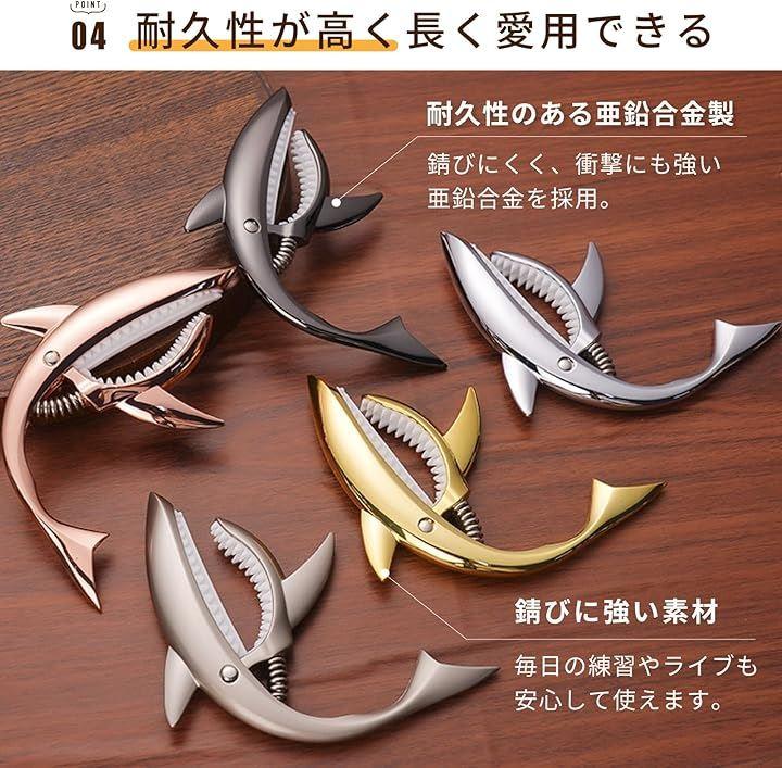 サメ型デザインが特徴的なカポタストは、ユニークでかわいい外観がおしゃれなアクセントとなり、練習や演奏の時間をより楽しく彩ります。