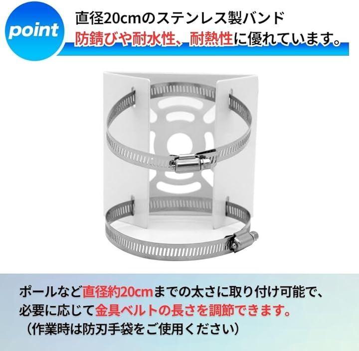 ポールなど直径約20cmまでの太さのものに取り付け可能であり、必要に応じて金具ベルトの長さを調節できます
