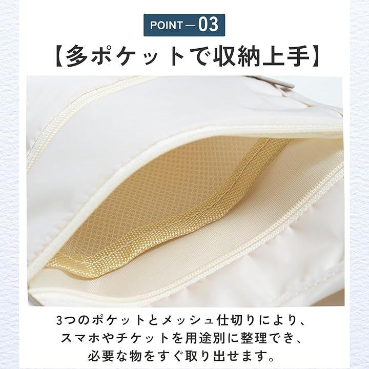 「多ポケットで収納上手」3つのポケットとメッシュ仕切りにより、スマホやチケットを用途別に整理でき、必要な物をすぐ取り出せます。