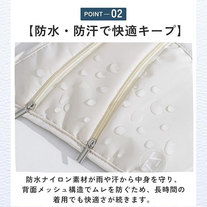 「防水・防汗で快適キープ」防水ナイロン素材が雨や汗から中身を守り、背面メッシュ構造でムレを防ぐため、長時間の着用でも快適さが続きます。