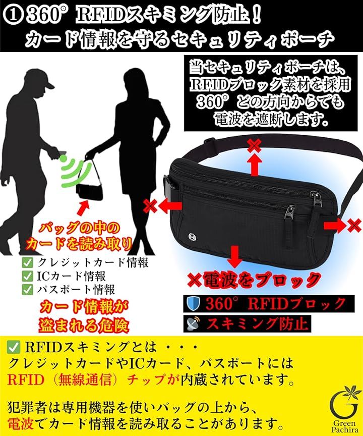 本商品はRFIDブロック素材を採用したスキミング防止セキュリティポーチ。