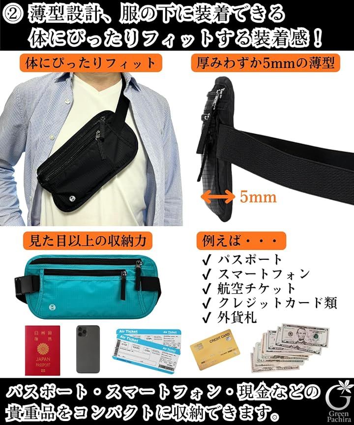 「厚みわずか5mmの薄型設計」薄型デザインのセキュリティポーチは、服の下に装着できるインナーポーチ仕様。