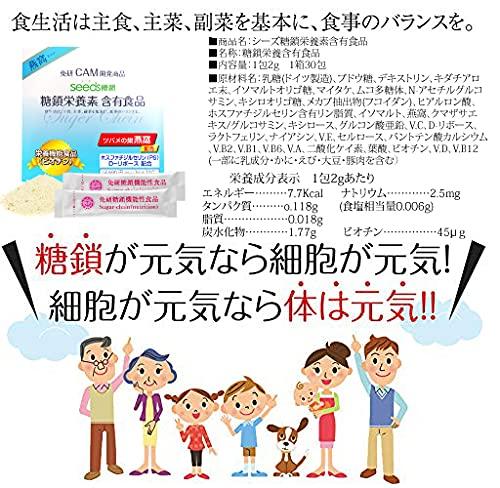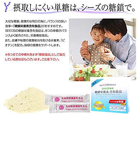 Seeds(シーズ)糖鎖は、糖鎖に必要な8つの糖鎖構成成分がバランスよく配合され、さらにビオチンを含んだ栄養機能食品です。 毎日の健康維持のため、1日1~3包を目安に、水またはぬるま湯とともにお飲みください。 ※本品は天然物を使用していますので、色調などが変わる場合がありますが、品質には問題ありませ んので安心してお召し上がりください。 8種類の糖鎖構成成分をバランス良く摂取できます。 飲みやすい顆粒タイプ 内容量 60g(2g×30包/1箱)