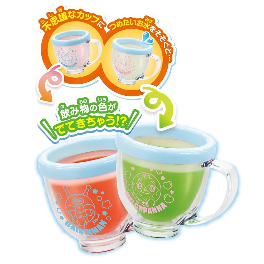 「ケトルのあそびかた」ケトル本体のアンパンマンの頭の上まで水を入れます。ケトル本体のボタンを押すと、ケトルのお水に泡がぶくぶくと立ち、氷と水を混ぜて冷やすことができます。遊べる温度(15度以下)になると、ケトル側面にばいきんまんとドキンちゃんの目もりの絵柄が出てきます。「アンパンマンラーメンのあそびかた」アンパンマンラーメンにケトルからお水を注ぐと、ラーメンが浮き上がります。ラーメンが浮き上がって ナルトにアンパンマンの顔が出てきたら出来上がりです!「マグカップのあそびかた」マグカップにケトルからお水を注ぎます。ばいきんまんトマトスープは赤色、メロンパンナちゃんホットティーは緑色に色が変わり、 飲み物を注いだようになります。※35℃~45℃のお湯で、元の色に戻せるので、何度でも繰り返し遊べます