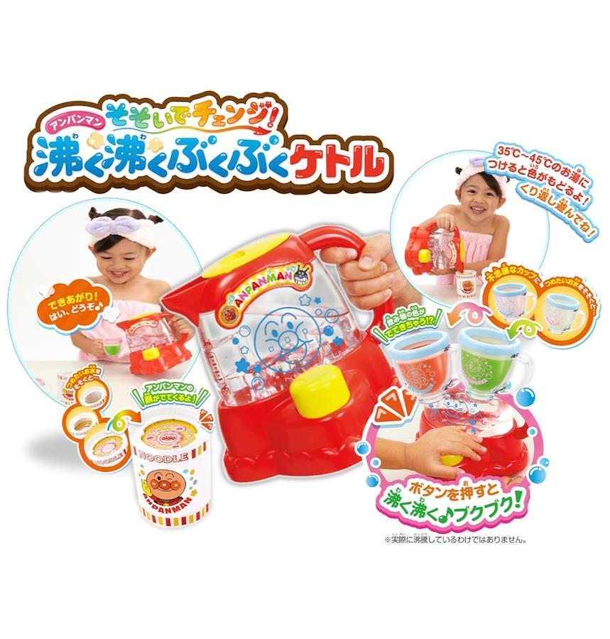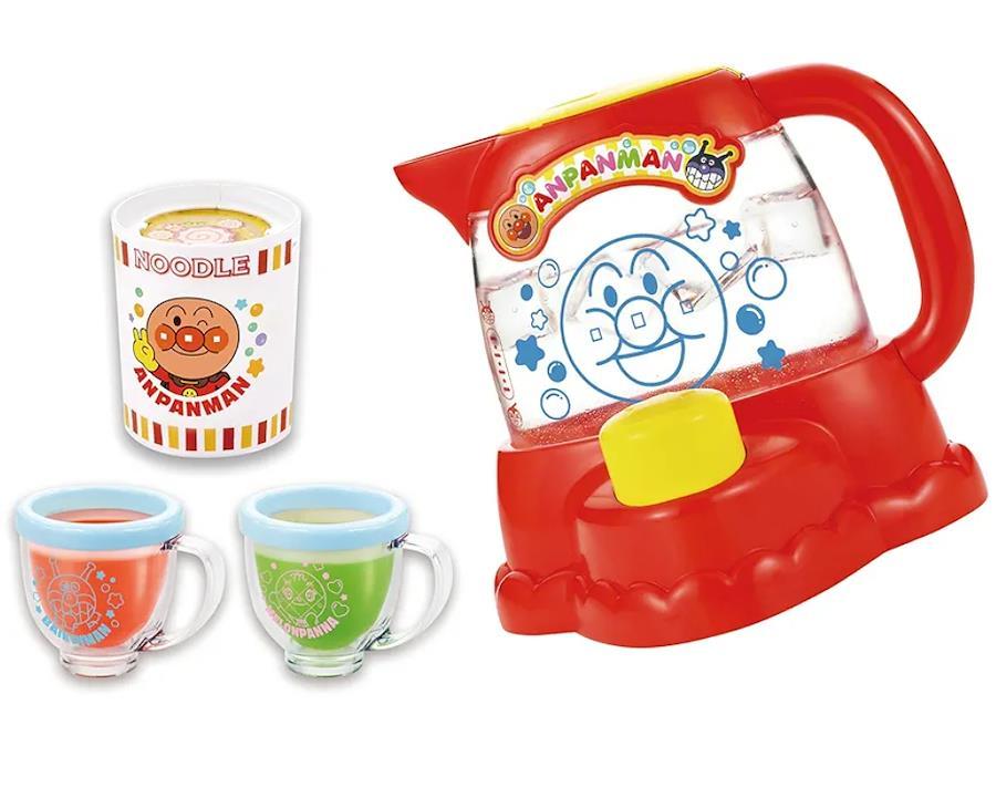 アンパンマンの電気ケトルごっこ遊びのバストイが登場!マグカップやラーメンにお水を注ぐと不思議!?色が変わったり、絵が浮き出たりするよ!本物みたいで楽しい!ぶくぶくお湯が沸かせる電気ケトルのように、ボタンを押すと泡がぶくぶく出てきます。パパやママのようにケトルからお水を注いでみよう!不思議!ラーメンが出来上がってなるとにアンパンマンの顔が出てきたり、 マグカップの色が変わっておいしそうな赤色のトマトスープや緑色のホットティーを注いだようになります!お水でごっこ遊びを楽しんじゃおう!