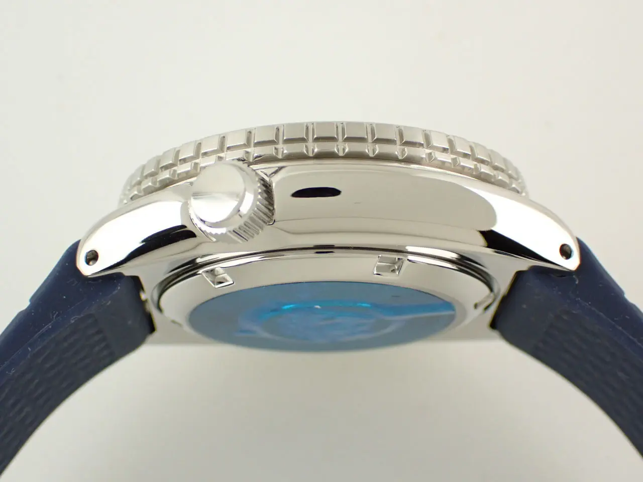 こちらの時計は、映画史に残る不朽の名作「JAWS」の公開50周年を記念して、世界限定5000本(うち国内700本)の数量限定で発売されたスペシャルエディションです。型打ち模様を全面に施したダイヤルに、ブルーとシルバーのグラデショーン塗装が施されており、よく見るとサメが潜んでいます。6時位置には映画のタイトルロゴを配置。