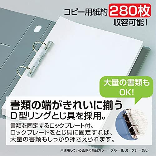 使いやすさを考えたリングファイル。大量の書類もしっかり押さえるオリジナル形状のロックプレート付。表紙が不意に開いてしまう心配がないストッパー付。大量の書類もしっかり押さえるオリジナル形状のロックプレート付。書類の端が揃うDリング金具。ファイルが引き出しやすい指穴。背見出しの裏面は分類整理に便利なタイトル記入スペース。指穴付きで抜き差しも簡単。