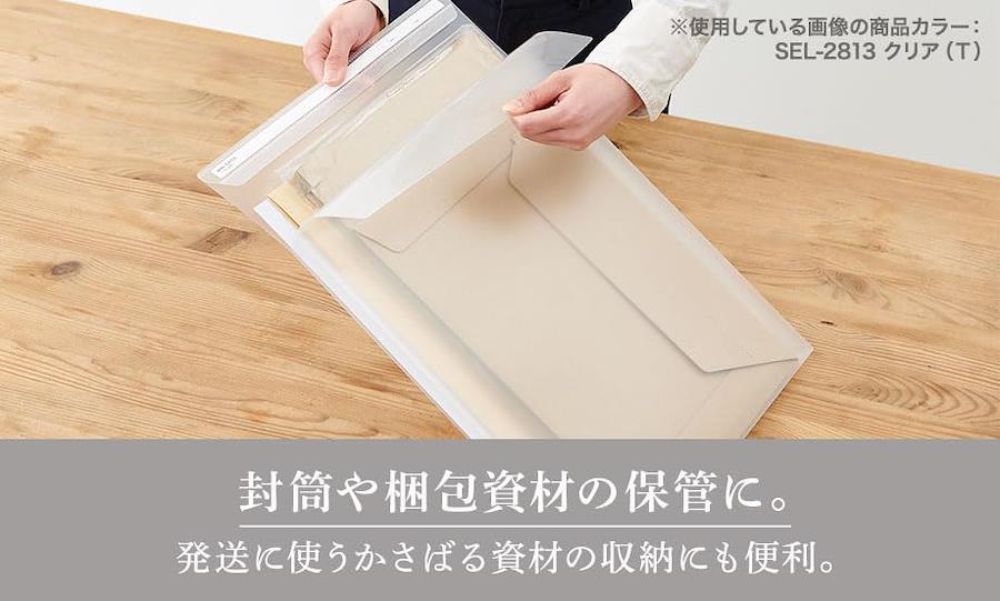 反らすだけで開くB4サイズのフタ付ファイル。握力や引っ張る力を必要とせず、誰でも感覚的に開閉できるフラップ機能付き。B4サイズの賞状や半紙、封筒やポスターなどの収納に便利。サッと収納して折れやホコリを防ぎます。間口が大きく開いて収納物の出し入れがスムーズ。作品や厚みのある紙類、発送用の梱包資材なども収容可能なマチ付き仕様。作品の持ち出しや推し活グッズの保護など、外出先での持ち歩きにも便利。バッグに入れたままスムーズな出し入れが可能です。水に強い見出しラベル付き。市販の収納ボックスと合わせて使うと見出しが見やすく更にスッキリまとまります。汚れや水に強い再生PP素材を使用。