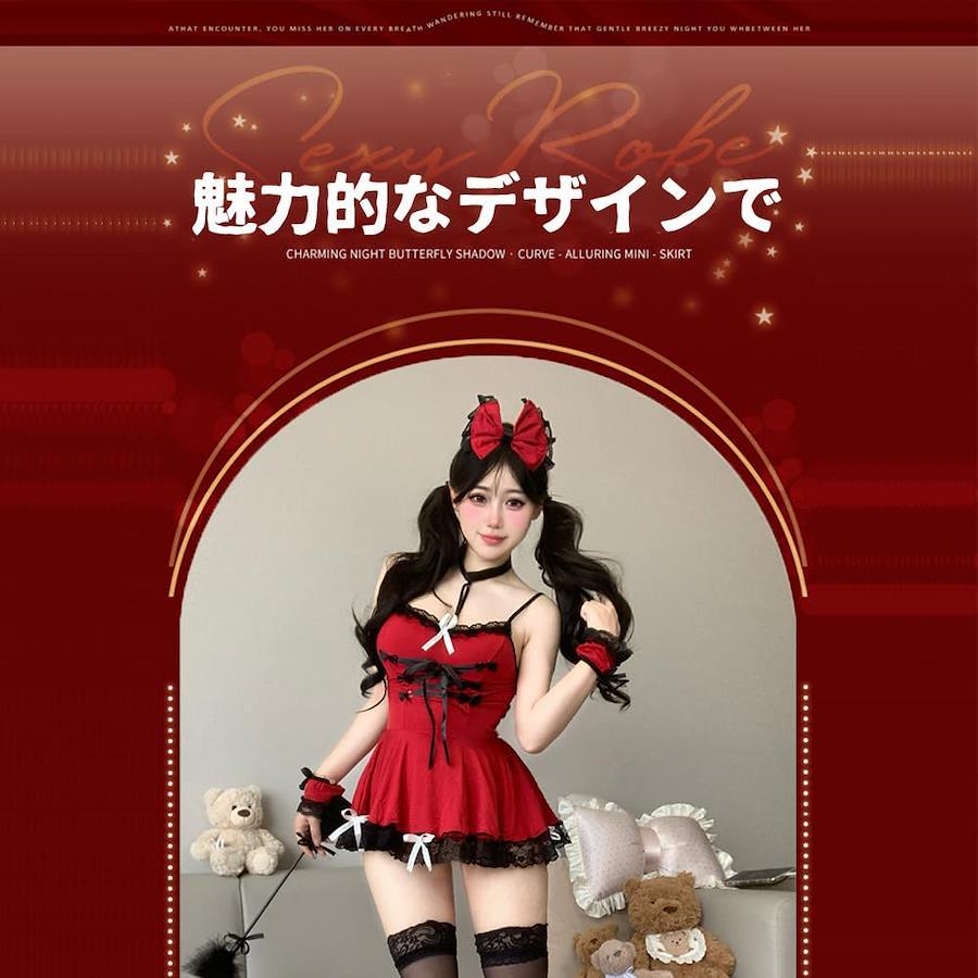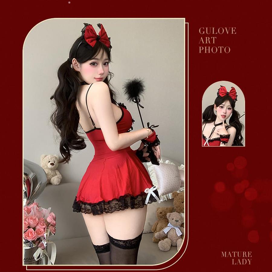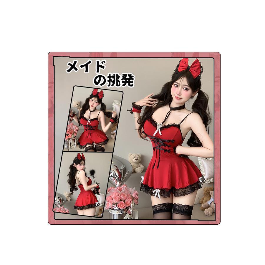 [Sekuee] Sexy Lingerie One-Piece Dress, Backless Babydoll Maid Outfit, Red Headband, Off-the-Shoulder Dress, Erotic and Tempting