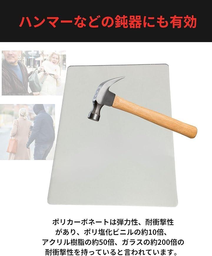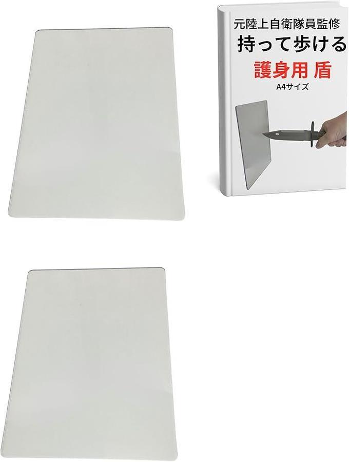 元陸上自衛隊員監修の大手防犯盾の素材を参考にした、5mm厚のポリカーボネート製のA4サイズの防刃板です。