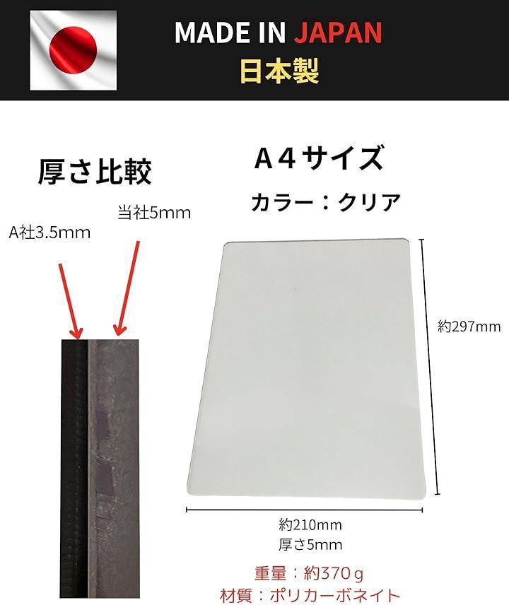 サイズ:約210mmx297mmx5mm 重さ約370g 材質:ポリカーボネート 日本製 。
