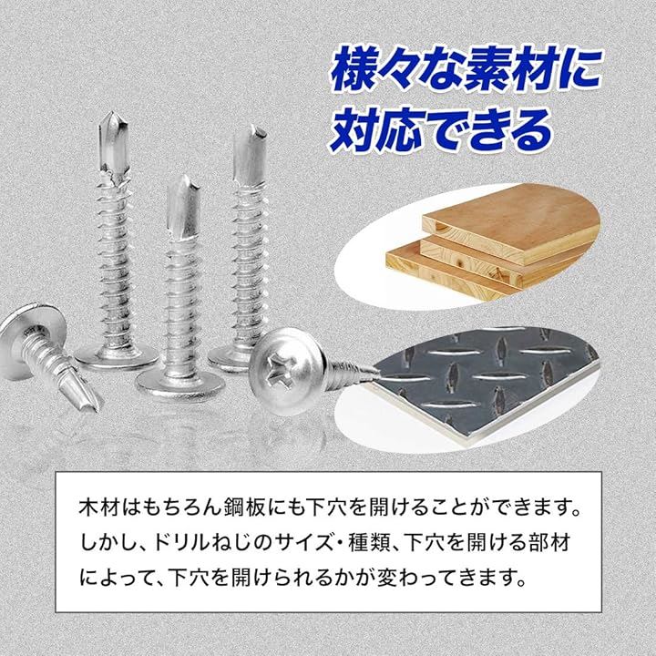 100本入りのセットで、石膏、石膏ボード、鉄板、木材、コンクリート、PVC、アルミなどに対応しています。