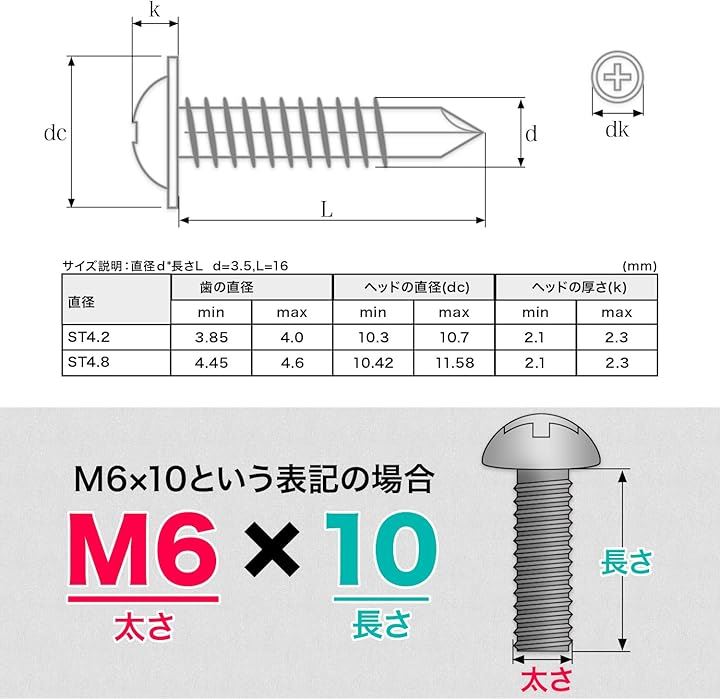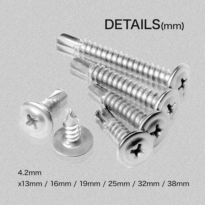 このドリルネジは、ステンレス製のシンワッシャーとモドトラスの頭部形状を備え、4.2mmのメトリックスレッドを持っています。
