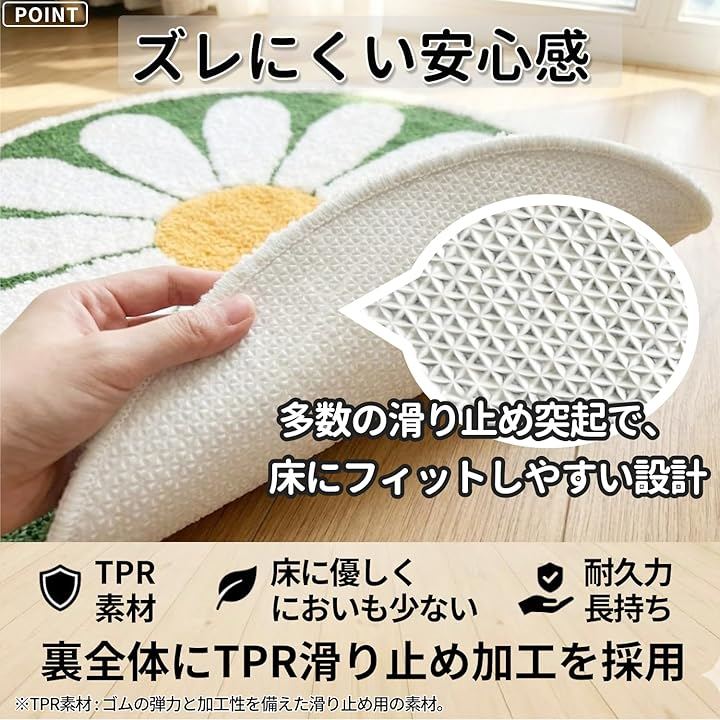 「暮らし華やぐデザイン」 大きなデイジー柄の半円形マット。