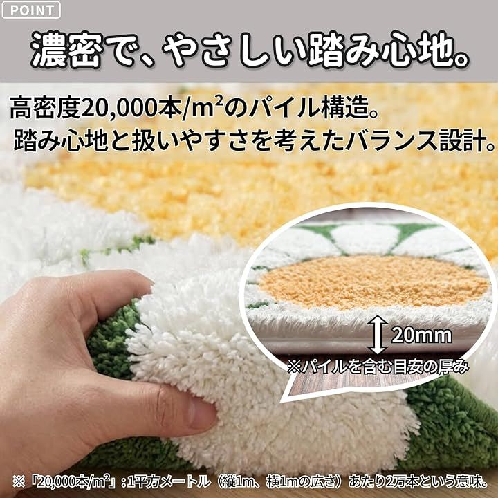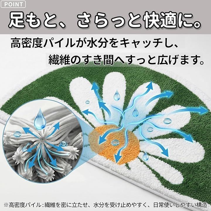 ・高密度パイルでふんわりした踏み心地 ・厚みは控えめで、扱いやすく乾きやすい設計 ・洗濯機でお手入れ可能 ・半円形のため、浴室ドア前や玄関にフィット ・通常使用で毛抜けが少なく、日常使いしやすい