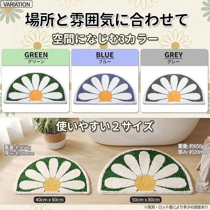 ・高密度パイルでふんわりした踏み心地 ・厚みは控えめで、扱いやすく乾きやすい設計 ・洗濯機でお手入れ可能 ・半円形のため、浴室ドア前や玄関にフィット ・通常使用で毛抜けが少なく、日常使いしやすい