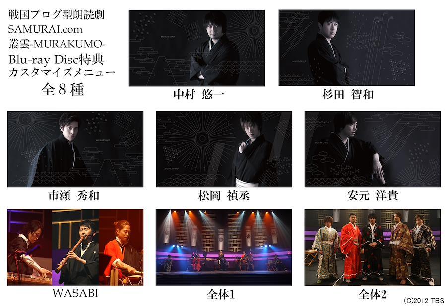 戦国ブログ型朗読劇「SAMURAI.com 叢雲-MURAKUMO-」ブルーレイ化決定! ●もしも、戦国時代にブログ文化があったら? というテーマの元に展開される新感覚戦国ブログ型朗読劇! ●人気実力派声優5名の競演! (中村悠一、杉田智和、市瀬秀和、松岡禎丞、安元洋貴) ●音楽監修は、吉田兄弟の兄 吉田良一郎のソロプロジェクトとして誕生した、津軽三味線(吉田良一郎)、尺八(元永拓)、箏(市川慎)、太鼓(美鵬直三朗)の4名による代表的な和楽器が集結した新・純邦楽ユニット、WASABI(わさび)が担当!