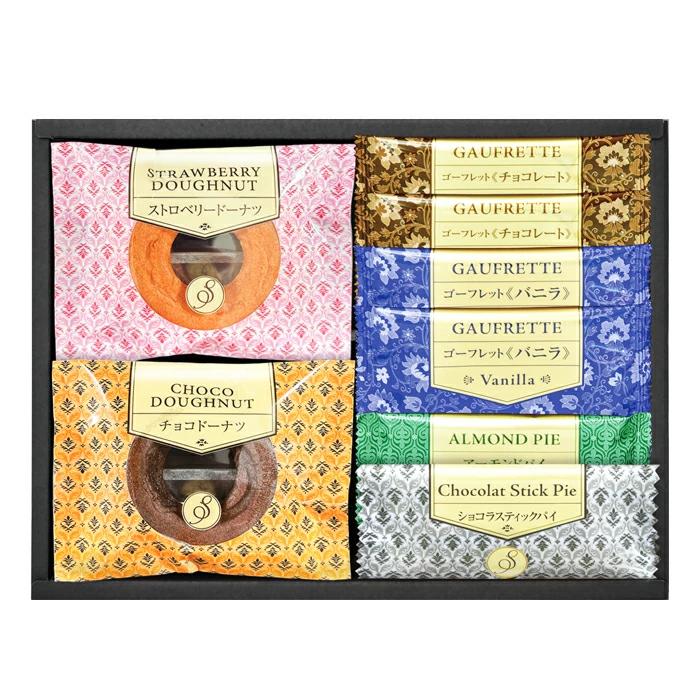 ゴーフレット(チョコ・バニラ)×各2、アーモンドパイ、ショコラスティックパイ、焼ドーナツ(チョコ・ストロベリー)×各1