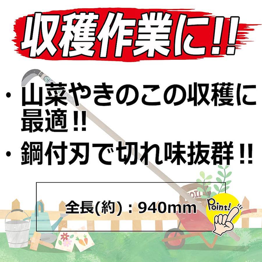 抜群の切れ味で山菜やきのこの収穫に最適【用途】収穫鎌【特徴】・きのこ・山菜収穫用・鋼付刃で切れ味抜群【注意事項】※本来の用途以外には使用しないでください。※使用前には本体あるいは部品にがたつき・緩みが無いことを確認してください。※使用の際には保護めがね・手袋などを着用してください。※使用後は汚れを取り、子供の手の届かない安全な場所に保管してください。