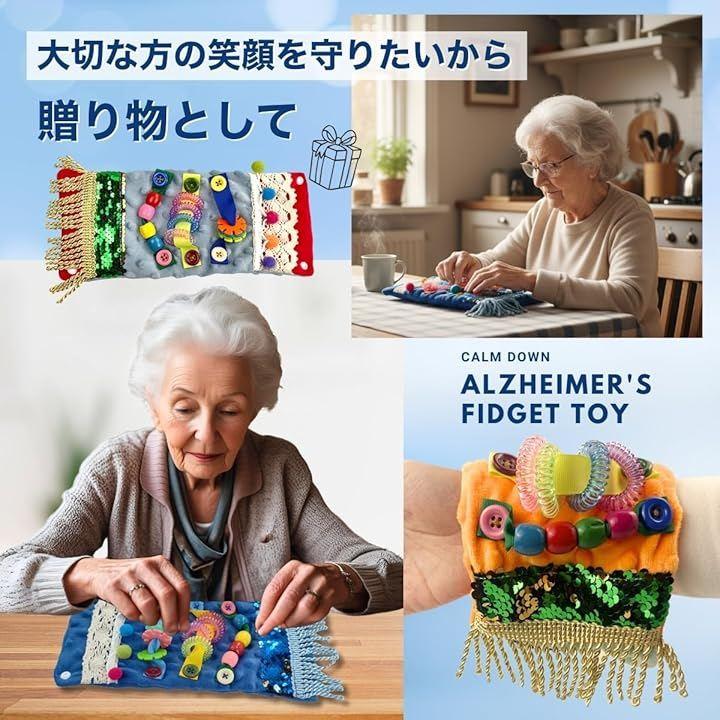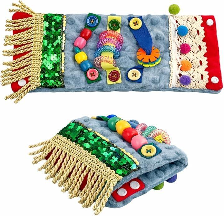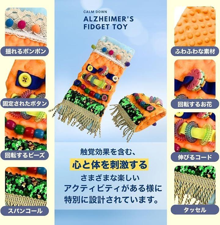 「触れて安心、心を落ち着かせる感覚サポート」 揺れるポンポン、スパンコール、回転するビーズやボタンなど、さまざまな素材の質感が指先から脳を刺激。
