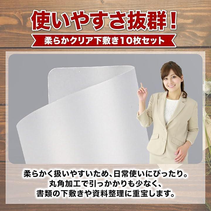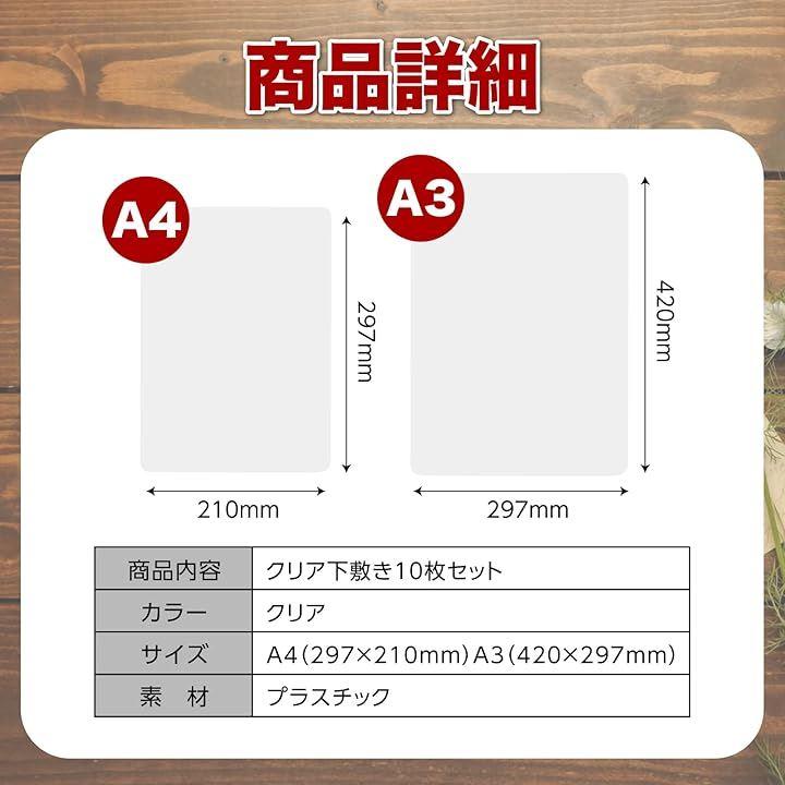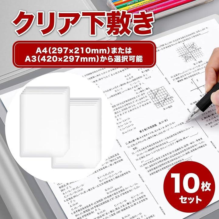 「商品内容」クリア下敷き10枚セット「カラー」クリア 「サイズ」A4(297x210mm)A3(420x297mm)「素材」プラスチック *モニターの環境により、色の見え方に若干差が生じる場合がございます。