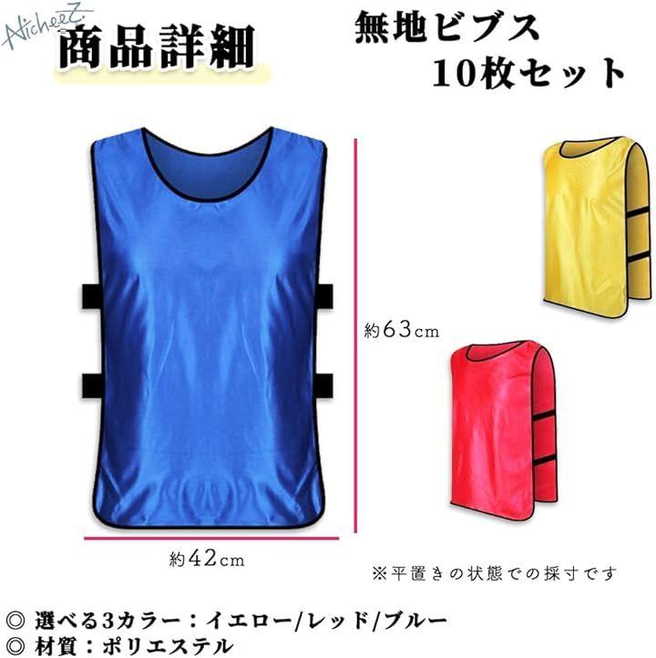 「商品内容」 大人用無地ビブス10枚セット 材質:ポリエステル カラー:レッド/ブルー/イエロー サイズ:長さ/約63cm 幅/約42cm