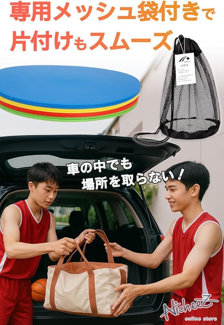 「収納袋付きで持ち運び&管理もスムーズ」専用のメッシュ収納袋付きだから、10枚をすっきりまとめてチームでの持ち運びにも便利。