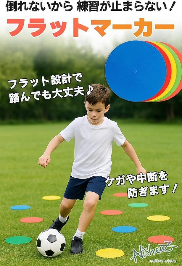 「倒れない・踏んでも安心なフラット設計」従来の三角コーンと違い、高さのないフラット形状なので、ぶつかっても倒れず練習の流れを止めません。