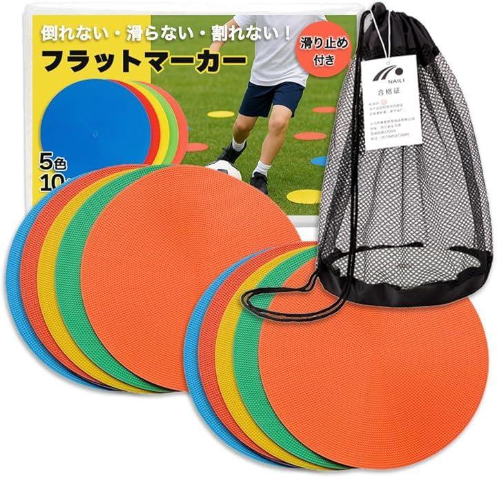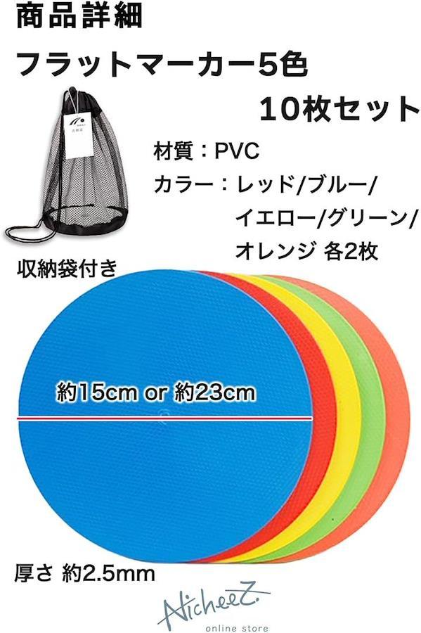 「商品内容」 フラットマーカー5色10枚セット(収納袋付き) 材質:PVC カラー:レッド/ブルー/イエロー/グリーン/オレンジ サイズ:直径/約15cm・約23cm 厚さ/約2.5mm