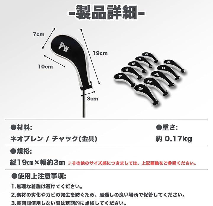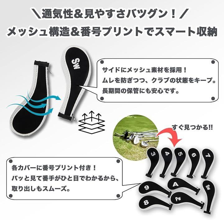「10個セットでアイアンをフルカバー」このセットには10個のアイアンカバーが含まれており、3番から9番、PW、AW、SWなど、主要なアイアンをすべてカバーできます。