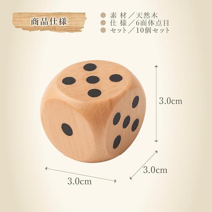 「商品仕様」木製サイコロ10個セット/サイズ:約3.0x3.0x3.0cm/素材:天然木/仕様:6面体点目