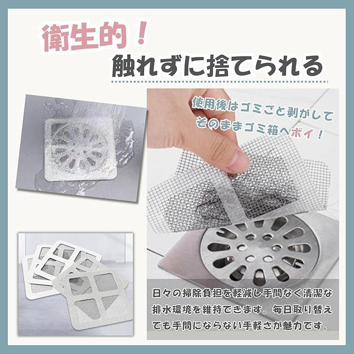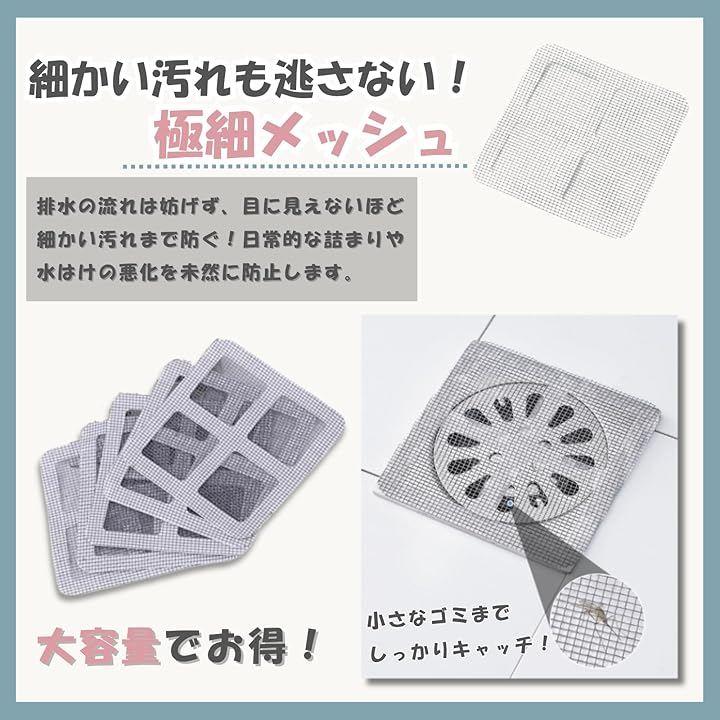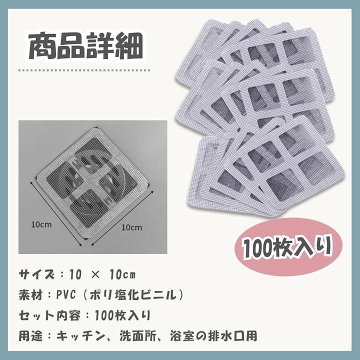 「商品詳細」 サイズ:100 x 100mm 素材:PVC(ポリ塩化ビニル) セット内容:100枚入り 用途:キッチン、洗面所、浴室の排水口用