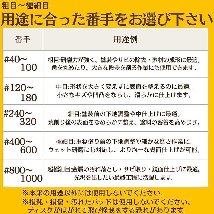 「13種類の番手」 ・粗目(#40~#100):塗装剥がし・荒削り・サビ取り ・中目(#120~#180):下地調整・中仕上げ ・細目(#240~#320):塗装面の仕上げ・ツヤ出し ・極細目(#400~#600):細かな研磨・ウェット研磨 ・超極細目(#800~#1000):金属の艶出し・最終仕上げ *選択した番手のみが入っています。