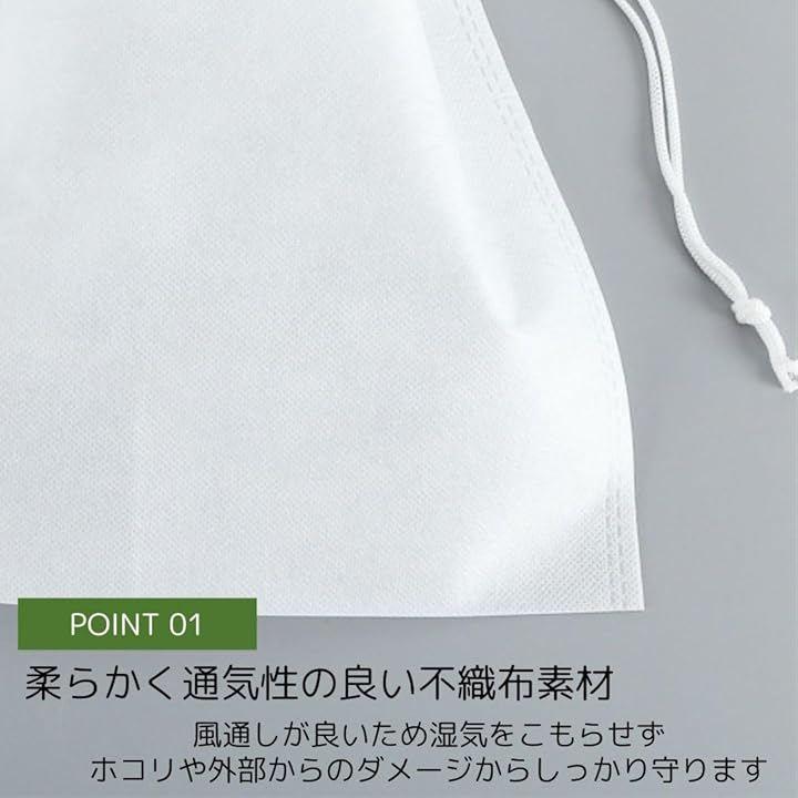 「衣類や小物の保管に最適」軽くて薄手の不織布巾着袋は中身が透けて見えるため管理や保管がしやすく、衣類だけでなくバッグや靴の収納にも最適です。