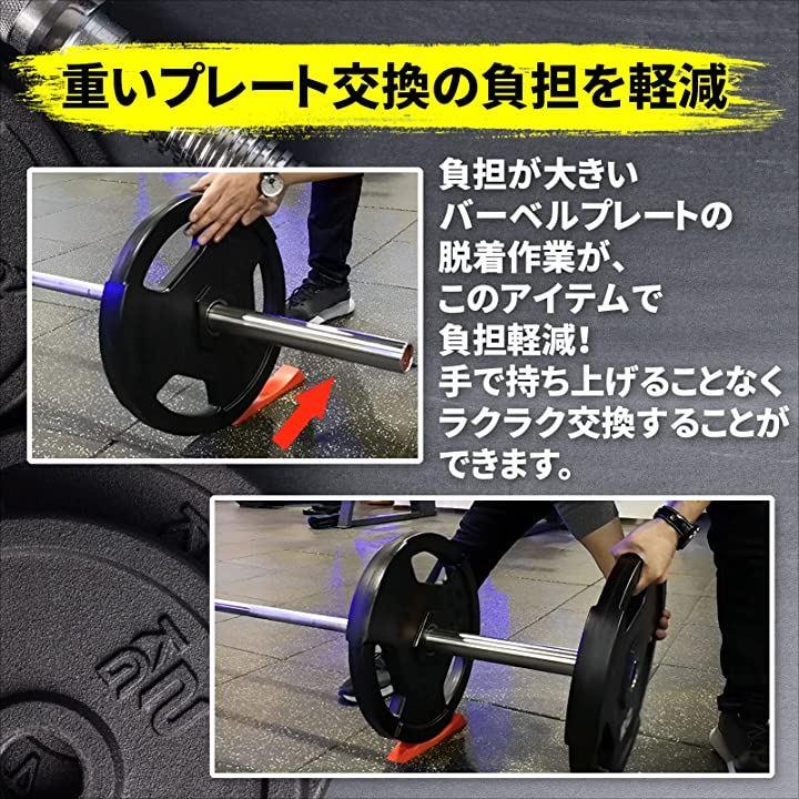 ・「重いプレート交換の負担を軽減」重いバーベルのプレートを交換する際、手で持ち上げてバーベルプレートを脱着すると、脱着作業の負担が大きくなってしまいがちです。
