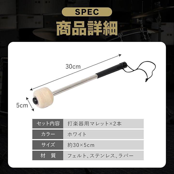 「商品詳細」セット内容:打楽器用マレットx2本 カラー:ホワイト サイズ:約30x5cm 材質:フェルト、ステンレス、ラバー *モニターの環境により、色の見え方に若干差が生じる場合がございます。