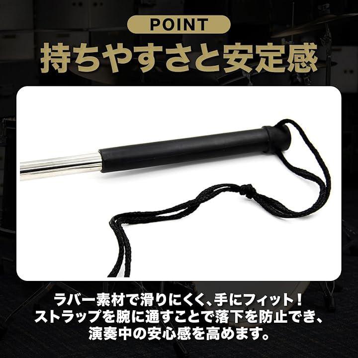「持ちやすさと安定感」グリップ部分のラバー素材で滑りにくく、手にフィット。ストラップを腕に通すことで落下を防止でき、演奏中の安心感を高めます。