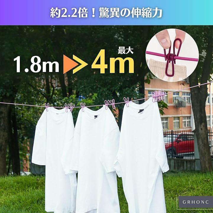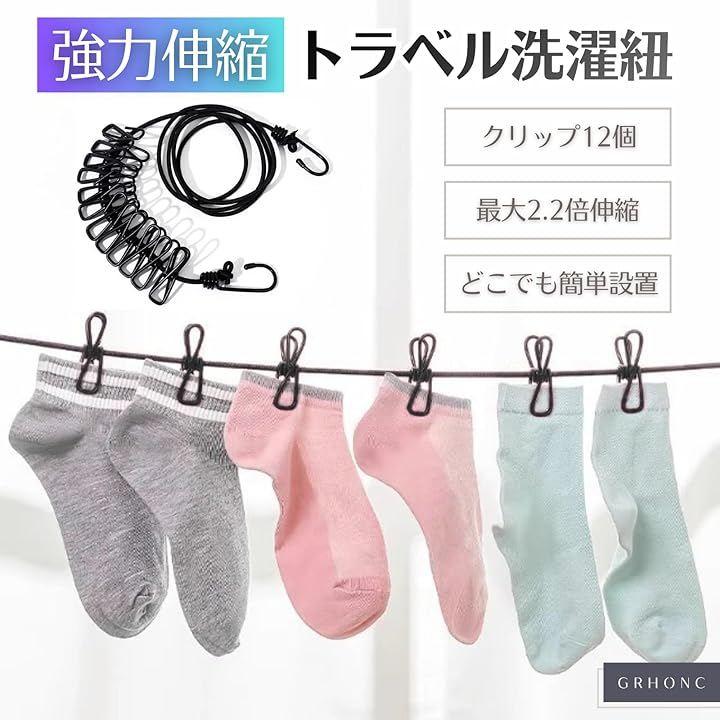 「セット内容」洗濯ロープ2本(クリップ各12個付き)「カラー」ブラック「サイズ」ロープ長:約180cm(最大約4mまで伸縮可能)「重量」約170g「素材」ロープ:ラテックスシルク+ポリプロピレン、クリップ・フック:鉄(PVCコーティング加工)「機能」強力伸縮 / 防風設計(フック固定)/ クリップ位置調整可能 / ノンスリップ仕様「利用シーン」キャンプ、旅行(ホテル内)、出張、ベランダ、室内干し、車中泊、アウトドア、災害時など