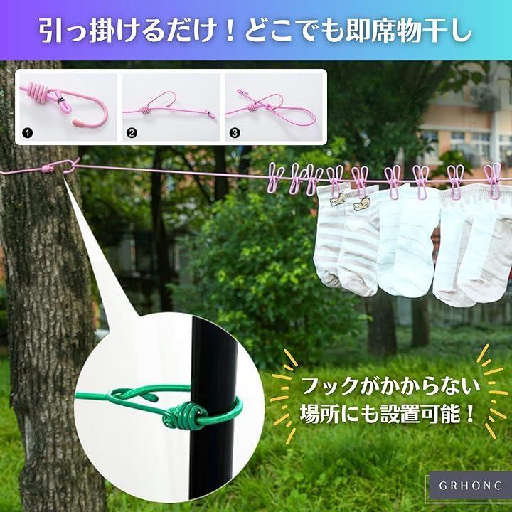 「両端フックで引っ掛けるだけ、工具不要で3秒設置完了」ロープ両端の頑丈な金属製フックを木・柱・フェンス・車のルーフレールなどに引っ掛けるだけで、あっという間に物干しスペースが完成。