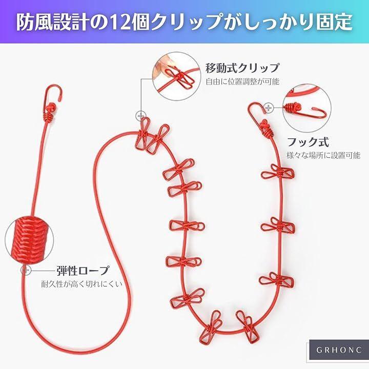 「防風設計の12個クリップがしっかり固定」クリップは強力なバネを採用し、濡れて重くなったジーンズやバスタオルもしっかりホールド。