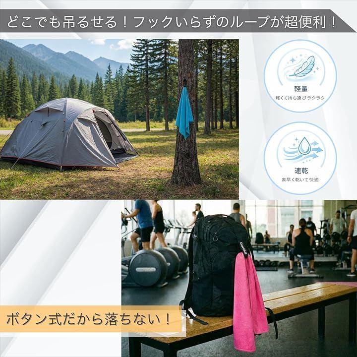 フックがない場所でも枝やポール、リュックに直接掛けて干すことができ、アウトドアやスポーツの現場で大活躍します。