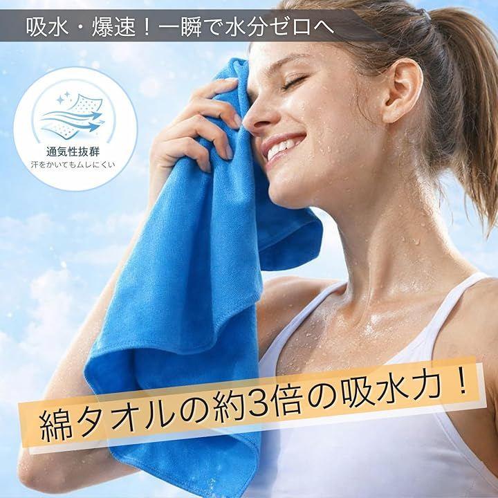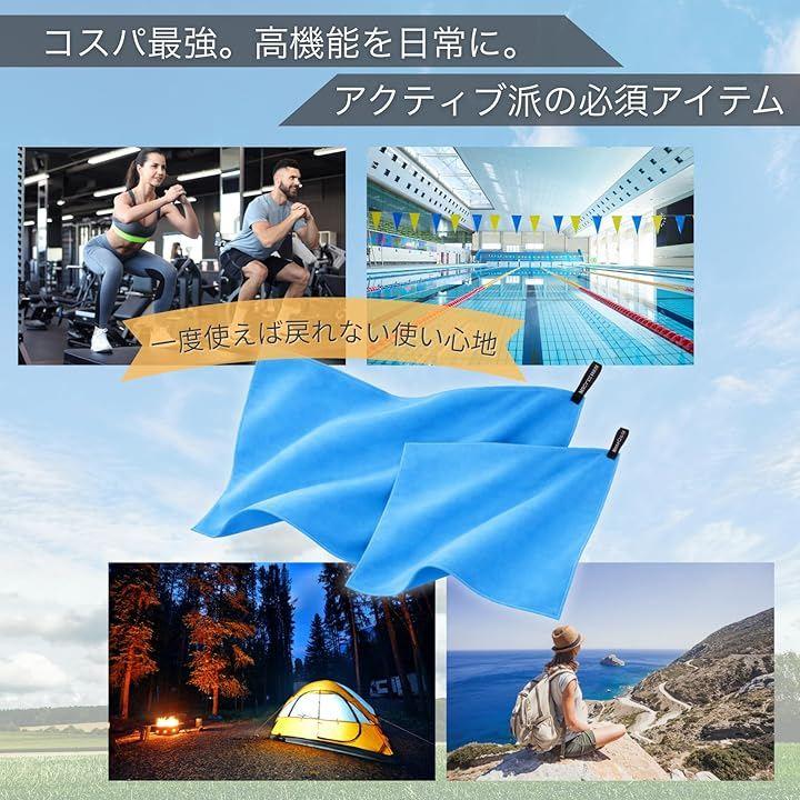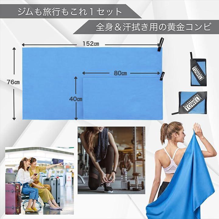 「便利な大小2サイズセット」 全身を包み込むバスタオル(152x76cm)と、汗拭きに最適なフェイスタオル(80x40cm)の2枚セット。