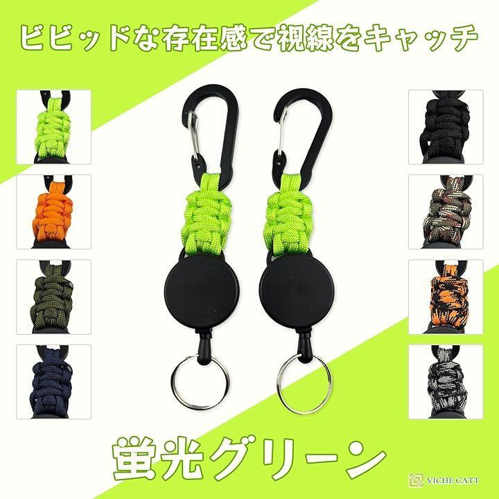 このリールキーホルダーは、伸縮性のあるワイヤーとパラコード製ストラップを組み合わせた便利アイテムです。