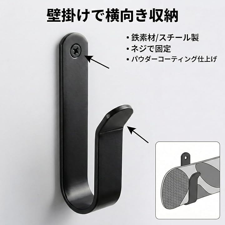 安定しやすいJフック形状: 先端が立ち上がった形で、ボードを掛けた際にズレ落ちにくい設計です。