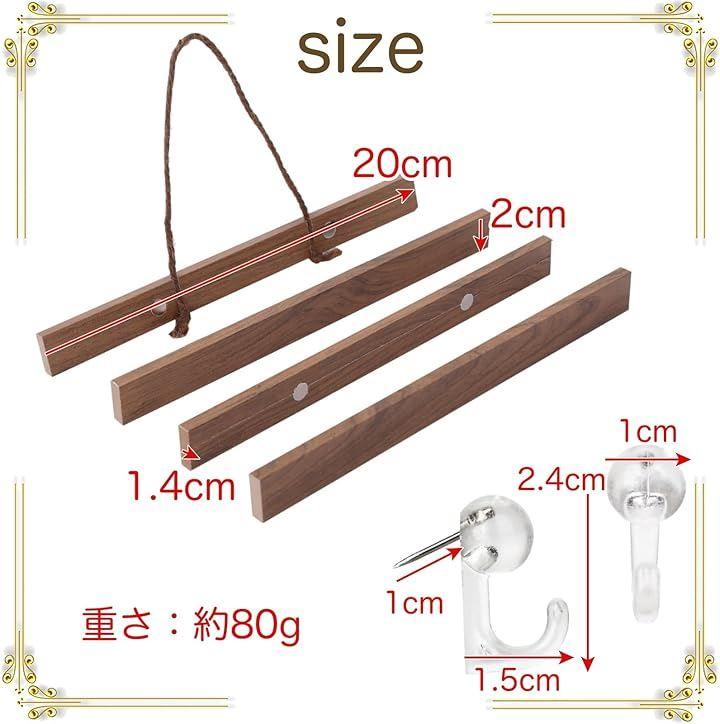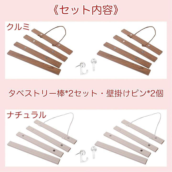 《サイズ》長さ:20x2x3cm / 重さ:約80g 《セット内容》タペストリー棒x2セット・壁掛けピンx2個《カラー》クルミ / ナチュラル *賃貸物件での壁掛けピンのご使用は事前にお確かめになってからご使用下さい。