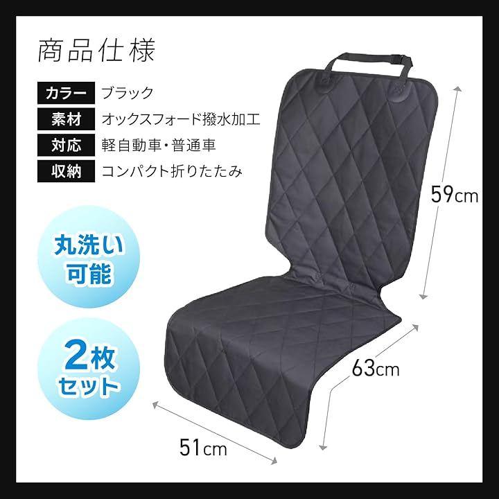 「商品仕様」シートカバー2枚セット/背もたれ長:59cm/シート長:63cm/シート幅:51cm/カラー:ブラック/素材:オックスフォード撥水加工/対応:軽自動車・普通車/収納:コンパクト折りたたみ/丸洗い可